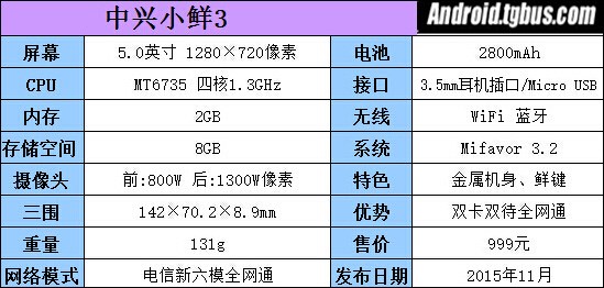 小鮮系列手機向來是中興攜手中國電信打造,定位千元市場,憑借著較高的性價比在電信用戶中有著一定口碑。此次的中興小鮮3仍主打青春風格,與上代產品相比,將運行內存提升為2GB,添加了指紋識別和金屬金屬的元素。此外小鮮3還搭載了64位MT6735四核處理器,機身存儲為8GB,最大支持128GB的存儲拓展,屏幕為5英寸720P分辨率,攝像頭是1300萬像素+500萬像素的組合。可以看出,這個配置相比於主流的“紅藍產品”只能說是一般,不過它卻是全網通雙卡雙待,對電信用戶十分厚道,其性價比還是較高的。