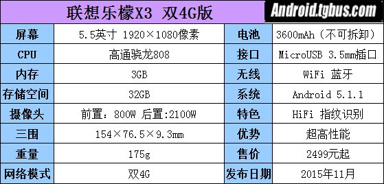 聯想樂檬X3 雙4G版采用了一塊5.5英寸1080P的屏幕;配備了一枚高通骁龍808處理器;前置800萬後置2100萬像素攝像頭;3GB RAM+32GB ROM內存容量;3600mAh大容量電池;擁有指紋識別功能並配有NFC功能;配備專業HiFi芯片,全時HiFi享受;雙4G網絡支持;售價為2499元。