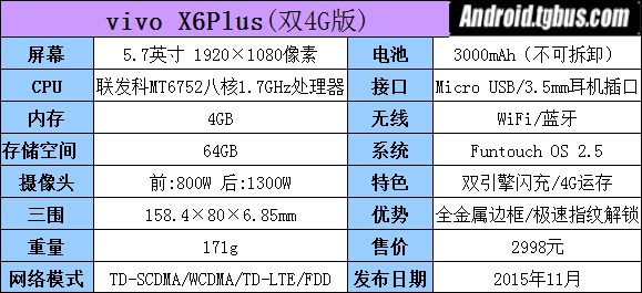 在機身配置上,vivo X6Plus采用5.7英寸1080P的Super AMOLED屏幕,搭載聯發科MT6752八核1.7GHz處理器,擁有4GB RAM和64GB ROM,前置800萬像素攝像頭後置1300萬像素攝像頭,擁有3000mAh大容量電池。目前官方售價2998元。