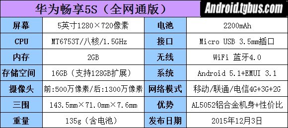 參數配置相比暢享5有不小提升,加入了FPC第二代按壓式指紋識別傳感器。硬件方面,暢享5S搭載聯發科MT6753T Cortex-A53 八核1.5GHz處理器,擁有2GB RAM和16GB ROM存儲組合。屏幕為5英寸大小,分辨率為1280x720,采用GFF全貼合工藝。全網通版支持移動、聯通、電信三大運營商的4G/3G/2G網絡制式,Micro SIM+Nano SIM卡槽設計,支持電信副卡盲插。