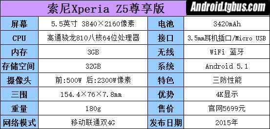 Xperia Z5尊享版配備一塊5.5英寸4K級別屏幕,高通骁龍810+3GB RAM,後置相機為2300萬像素,前置則是500萬像素,24mm廣角,主相機支持0.03s超快混合對焦,電池為3430mAh。