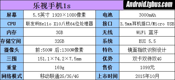 配置方面,樂視手機1s搭載MTK Helio X10 Turbo處理器,3GB RAM及32GB ROM,擁有一塊5.5英寸的1080p分辨率In-Cell屏幕,搭配前置500萬、後置1300萬像素的兩枚攝像頭,電池容量3000mAh,支持樂閃充,預裝EUI 5.5系統,采用革命性創新的意識流交互。網絡制式方面支持移動聯通雙4G/雙卡雙待。