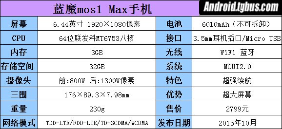配置方面,藍魔MOS1 max配有一塊6.44英寸1080p分辨率的屏幕,內置主頻1.3GHz的聯發科MT6753八核64位處理器,3GB RAM+32GB ROM。前置鏡頭800萬像素、後置鏡頭1300萬像素,電池容量高達6010毫安時。