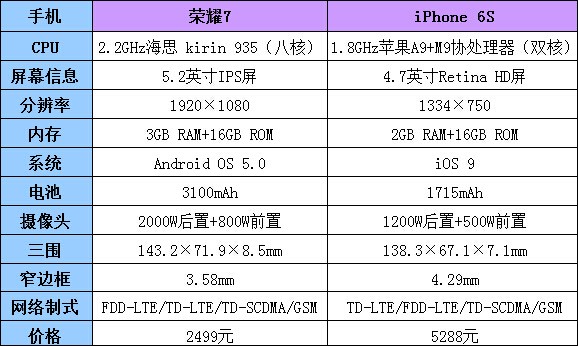 榮耀7搭載5.2英寸JDI負向液晶屏,八核麒麟935 64位處理器,Android 5.0系統,3GB RAM,2000萬後置藍寶石攝像頭,3100mAh電池。