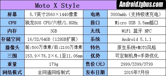 由於受到骁龍810發熱影響,Moto X Style還是很聰明的更換了CPU-骁龍1.8GHz六核808處理器,並與之匹配Adreno 418 GPU和3GB DDR3運行內存。Moto X Style同時還配備了5.7寸2K屏幕,提供前置500萬像素和後置2100萬像素攝像頭,內置3000mAh電池,支持極速充電技術。全網通網絡制式則是標配。