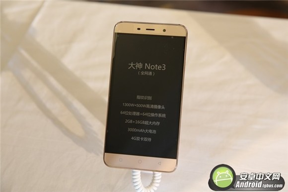 在最開始,展示機的膜都沒撕掉,於是我就拍了一張參數圖。大神Note3全網通金色版,售價為999元,采用八核64位處理器,5.5英寸屏幕,720P分辨率,2GB RAM+16GB ROM,前置500W後置1300W像素攝像頭,3000mAh大電池,4G雙卡雙待網絡制式。