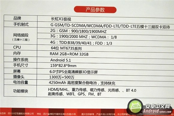 長虹X1極視手機支持五模十三頻,也就是說支持移動聯通雙網4G,並且可以雙卡雙待。搭載聯發科MT6735的64位處理器,擁有2GB RAM+32GB ROM的內存組合。6英寸IPS全高清裸眼3D顯示屏是其最大的特點,內置豐富的3D影視資源和4250mAh的超大電池容量能讓用戶看個痛快。官方售價為1999元。