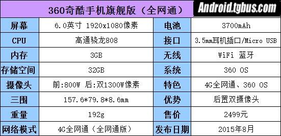 360奇酷手機旗艦版搭載了高通骁龍808處理器,功耗發熱和性能表現更為均衡,該機還輔以3GB的運行內存,鋁鎂合金金屬機身,6英寸1080P大屏,3700mah梯形高密度電池,運行主打安全流暢的360 OS,更為給力的是上面也提到過的,奇酷旗艦版采用2顆1300萬像素主攝像頭,為用戶提供了更好的體驗和拍照效果。總體來看老周在設計上還是很用心的,接下來看看。