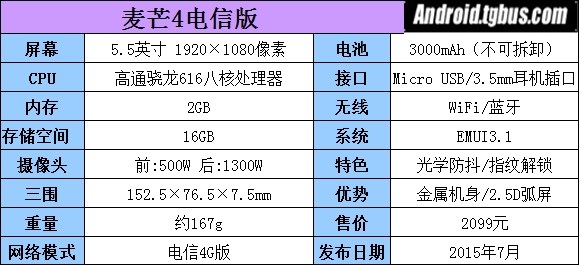 配置方面,華為麥芒4擁有標配版和高配版兩個版本,此次我們為大家評測的是钛空灰顏色的麥芒4電信版,其采用了5.5英寸FHD全高清屏幕,分辨率達到1920×1080,配備了高通骁龍616八核處理器。內存方面采用了2GB RAM+16GB ROM組合(比高配版略低),攝像頭方面,擁有1300萬像素攝像頭配以500萬像素前置攝像頭。續航方面,麥芒4內置3000mAh超大能量密度電池,運行基於Android 5.1的EMUI 3.1系統。