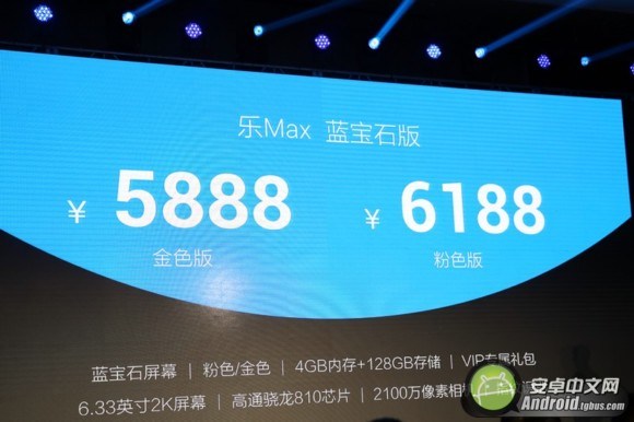 本次發布的樂Max藍寶石版共分為兩種顏色,金色版守家5888元,粉色版售價6188元。他擁有4GB的RAM和128GB的存儲空間,6.33英寸2K屏幕加上高通骁龍810 的芯片,讓整機性能出眾。