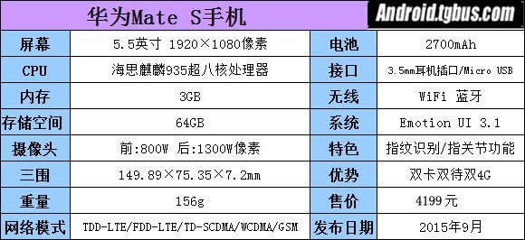 配置方面,華為Mate S臻享版配備有一塊5.5英寸1080P屏幕,搭載麒麟935八核處理器,運行內存為3GB,機身自帶64GB內存,支持內存卡擴展及雙Nano SIM卡雙待,運行基於Android5.1深度優化的EMUI 3.1,電池容量為2700mAh。主攝像頭為1300萬像素,前置相機為800萬像素,擁有雙色溫LED補光燈。