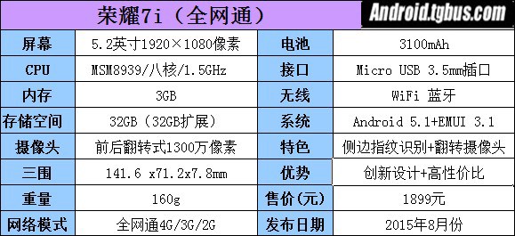 榮耀7i擁有一塊5.2英寸1080P屏幕,顯示效果清晰。全網通版涵蓋了中國移動、中國聯通以及中國電信在內的4G、3G、2G七模十七頻網絡頻段。同時它還擁有骁龍64位八核616處理器,最高主頻為1.5GHz。全網通版配備3GB與32GB機身存儲空間,其他版本則是2GB+16GB的組合方式。續航方面,榮耀7i配備了3100mAh高能量密度大電池,配合智電3.0軟硬件一體化省電技術,可有效省電30%。