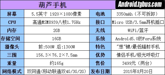 雖然葫蘆手機的配置並不是最主要的,但大家也需要了解一下。它擁有5.5英寸1080P屏幕,搭載高通MSM8939的八核1.7GHz處理器,2GB機身運行內存和16GB存儲空間。拍照方面它擁有500W前置攝像頭和1300W後置攝像頭,3350mAh的大容量電池也可保證用戶擁有充足的續航能力。值得一提的是,葫蘆手機是成對出售的,也就是說一買就是兩台,售價為3499元。它分為銀和藍、銀和粉、銀和銀、藍和藍、粉和粉、藍和粉多種顏色配對,是專為情侶手機設計的手機。