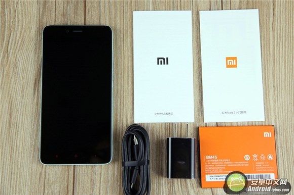 打開包裝盒,就看見今天的主角——紅米Note2高配版。包裝盒內除了主機外,還擁有一個充電插頭、一個數據線、一個小米手機三包憑證、一個熱門指南以及一塊電池。