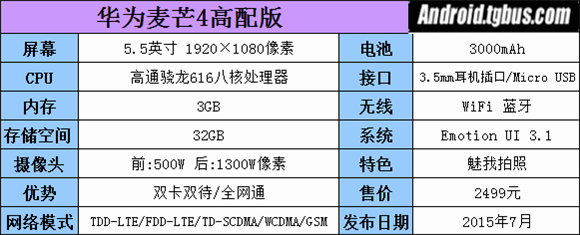 配置方面,華為麥芒4擁有標配版和高配版兩個版本,此次小編拿到的是華為麥芒4晨曦金高配版,其采用了5.5英寸FHD全高清屏幕,分辨率達到1920×1080,配備了高通骁龍616真八核處理器。內存方面也有了進一步的升級,采用了3GB RAM+32GB ROM組合,攝像頭方面,擁有1300萬像素攝像頭配以500萬像素前置攝像頭。續航方面,麥芒4內置3000mAh超大能量密度電池,運行基於Android OS 5.1的EMUI 3.1系統。