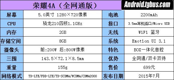 其它配置方面,榮耀4A采用了5英寸720P顯示屏,最高屏占比為72%,搭載1.1GHz四核骁龍210處理器,集成四顆Cortex-A7和Adreno 304圖形處理器,內置2GB運行內存和8GB存儲空間(可擴展),選用前置200萬像素和後置800萬像素的攝像頭組合,運行最新的Android 5.1系統+EMUI3.1,電池容量為2200mAh,支持BOX一體化音腔,以及高通QuickCharge 2.0快充。