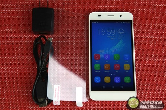 打開包裝盒,就看見今天的主角——榮耀4A,包裝盒內除了產品本身,還帶有一個屏幕保護膜,一塊電池,一個數據線以及一個電源插口,不過需要一提的是,此次小編拿到的產品是測試機,並非正式零售版。