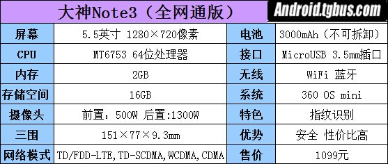 2015年7月20日,大神在北京發布了旗下全新產品——大神Note3。大神Note3是如今千元級智能手機中唯一一款搭載有指紋識別功能的機型,而在此前,搭載有指紋識別技術的智能手機,價格都在2500元以上,大神Note3將這個價位一下子拉低了1000多元,這種安全實用的高端功能幾乎一下子就成為了人們觸手可及的功能,不得不說這是業界的一大突破。