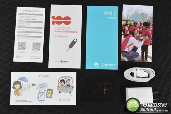 配件方面,榮耀7提供了Micro USB數據線、電源適配器、取卡針以及各類紙質說明文件。全網通版具有9V2A高壓充電器,充電更快:充電5分鐘可連續通話1小時,30分鐘即可充滿50%。