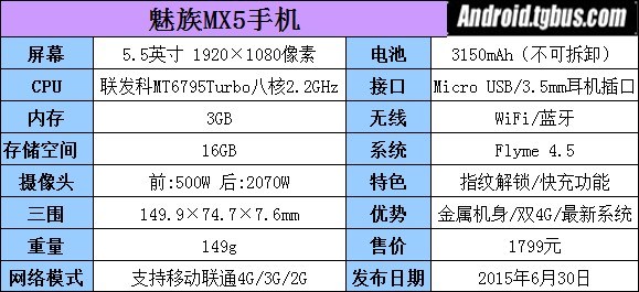 魅族MX5擁有5.5英寸1080P大屏,搭載聯發科MT6759 Turbo八核2.2GHz處理器,擁有3GB RAM和16GB ROM。機身前置500W像素攝像頭,後置2070W像素攝像頭。支持雙卡雙帶雙4G網絡制式,擁有3150mAh的電池容量和指紋識別功能。今天發布會公布的價格為1799元!