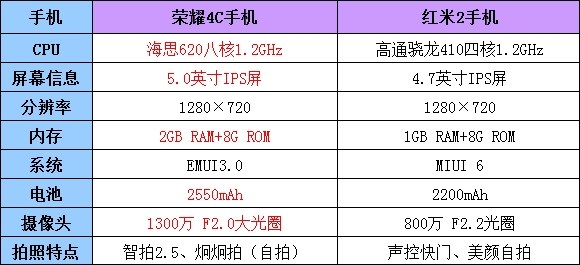 我們再來看看兩者的機身配置參數有何區別。榮耀4C手機采用海思620八核1.2GHz處理器,擁有5英寸720P的IPS屏幕,采用2G+8G的內存組合,在千元機裡配置已經算非常不錯的了。而且它1300萬的大光圈攝像頭在拍照功能上也非常強大,2550mAh的電池容量也是讓它在拍照時擁有更多續航時間。而紅米2手機單從配置上來講是不如榮耀4C手機的,CPU、內存、電池容量和攝像頭像素,但拍照主要還是看成像質量,接下來我們就以事實判斷兩者孰優孰劣吧。