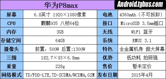 首先,介紹一下華為P8max的基礎配備。華為P8max配備了一塊6.8英寸超大屏幕,搭載麒麟935 八核64位處理器,64GB ROM+3GB RAM,前置500W後置1300W像素攝像頭,采用基於Android 5.1的EMUI 3.1操作系統,電池容量為4360mAh,雙卡雙待雙4G。