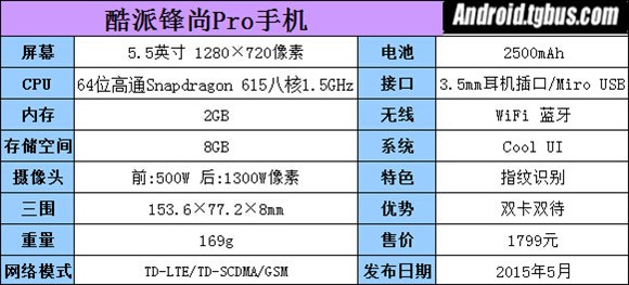 酷派鋒尚Pro采用了5.5英寸全貼合屏幕,分辨率為720P,內置一顆8核64位的高通骁龍處理器,2GB RAM+8GB ROM,攝像頭為500W前置+1300W帶LED補光燈的後置攝像頭,F2.0光圈,內置豐富的美顏、拍攝功能,鋒尚Pro還支持移動高速4G網絡,同時還支持雙卡雙待。