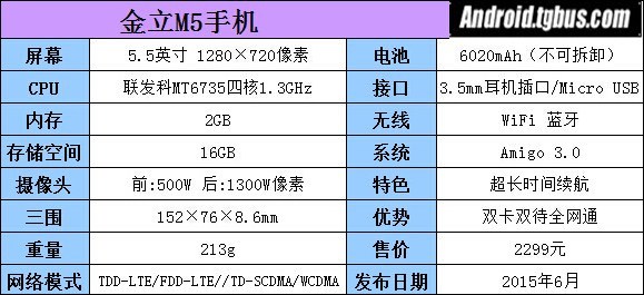 除了續航功能之外,金立M5還擁有一塊5.5英寸Amoled屏幕,機身厚度僅8.5mm,支持雙卡雙待雙4G網絡,支持全網通網絡,且兩個卡槽均支持多種模式。配備前置500萬像素和後置1300萬像素攝像頭,支持相位對焦和中置式馬達,采用聯發科最新的64位四核處理器MT6735,這顆CPU支持全網通4G基帶,核心頻率為1.3GHz,集成Mali T720顯示核心。內存為2GB RAM+16GB ROM,在語音方面,M5能夠進行語音喚醒、金立錄音和金立翻譯。