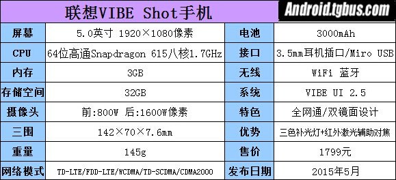 聯想VIBE Shot采用5.0英寸1080p觸控屏,搭載八核1.7GHz的骁龍615處理器,內置3GB內存和32GB機身存儲空間,支持Micro SD卡擴展,電池容量2900mAh,運行Android 5.0系統,對於一款主打拍照的手機,其采用了一塊1600萬像素的影像模組,光圈F2.2,16:9定制尺寸傳感器,支持光學防抖,另有6片高品質非球面鏡片。