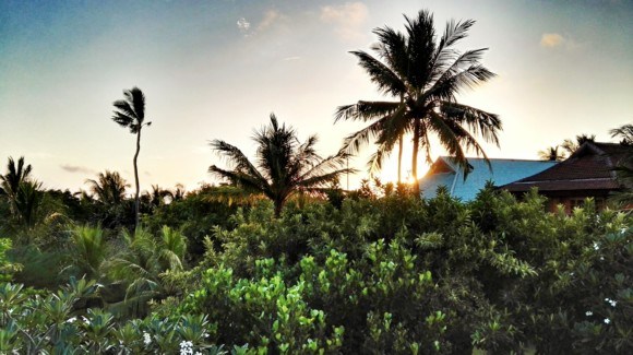 陽台外景拍攝即將落入地平線的夕陽(樣張),算是逆光拍攝,但近處樹葉的色彩對比度很飽滿和遠處棕榈樹的細節也很清晰。