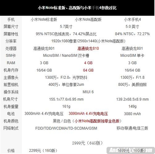 原本定在3月份正式發布的小米Note頂配版為何跳票?雷軍給出的解釋是:為了追求極致。售價方面小米Note頂配版從之前公布的3299元售價下調到2999元,這算是給米粉們一個滿意的答復吧。配置方面,采用骁龍810處理器,4GB LPDDR4內存芯片等也悉數亮相。而在一些小細節方面,小米Note頂配版也做了一些改動。例如:電池容量提升90mAh達到3090mAh等。