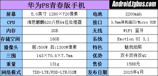 華為P8青春版理所當然使用了自家海思麒麟620八核64位處理器,不過這是移動與聯通雙4G版配置,而在電信版處理器則使用了高通骁龍615,同為8核64位處理器。內存方面則是16GB ROM與2GB RAM的組合方式。屏幕使用5英寸全貼合技術,擁有720P像素分辨率。攝像頭采用後置1300萬像素/F2.0光圈與前置500萬像素/F2.4光圈組合。同時它還配有雙卡雙待與2200mAh锂離子電池。
