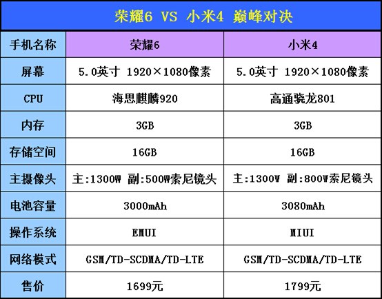 以上是榮耀6和小米4的技術配置,因為版本原因,我特別選擇了移動4G版本,同樣的3G RAM+16G ROM,,電池容量基本差不多,而價格也只相差100元,這樣的對比相對要公平很多。