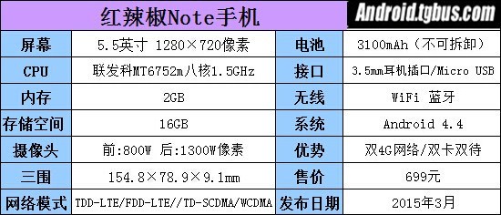 紅辣椒Note搭載了一塊5.5英寸IPS顯示屏,屏幕的分辨率為720P,可視角度達 178°;搭載了主頻為1.5GHz的64位聯發科MT6752m八核處理器,並采用運算速度更快的Cortex-A53架構。運行2GB內存以及16GB機身存儲(支持擴展),配置500萬+1300萬像素索尼堆棧式超清後置攝像頭,采用雙卡雙待設置,支持中國移動4G/3G/2G和聯通2G網絡;擁有一塊3100mAh容量電池。