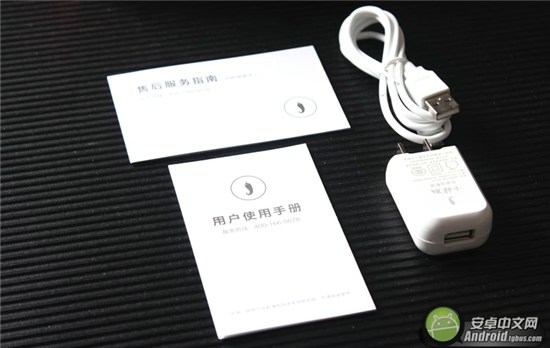 打開包裝盒,就看見今天的主角——紅辣椒Note。除此之外,在包裝盒內還有一個充電插口、一個數據線、一個用戶使用手冊以及一個售後服務指南。