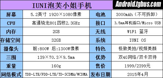 配置方面,IUNI i1采用一塊5.0英寸1080P屏幕,搭載目前主流的骁龍801處理器,2GB RAM與32GB ROM組合,後置攝像頭像素1300萬,主打的前置攝像頭像素為800萬,支持7級智能美顏與4大美顏模式,前置攝像頭支持錄制15秒短視頻功能。網絡制式方面支持移動聯通雙4G網絡,雙卡雙待,電池容量為3000毫安時。