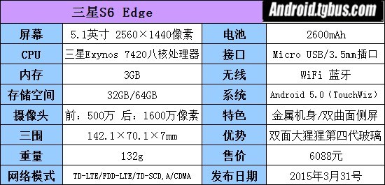 配置方面,三星S6 Edge采用骁龍810的自家核心Exynos 7420八核64位處理器,擁有3GB RAM。屏幕搭載了5.1英寸2560×1440分辨率的Super AMOLED屏幕,577ppi。攝像頭方面,500萬像素前置攝像頭和1600萬像素後置攝像頭,兩個攝像頭都擁有f/1.9大光圈。