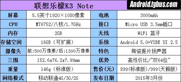 聯想樂檬K3 Note是國產首款Android 5.0系統手機,加之64位處理器使它成為名副其實的雙64位智能手機。另外值得一提的是,K3 Note天籁版還增加了陶瓷振片,配合隨帶包裝盒的共鳴腔體Hip-Box後可隨時享受天籁之聲。配置方面,K3 Note采用5.5英寸1080P屏幕、1.7GHz真八核處理器以及2GB內存與16GB手機存儲。網絡制式上,樂檬K3 Note真正實現雙卡雙4G,無論卡一還是卡二都能輕松設為主卡,簡單便捷。手機背面擁有一顆1300萬像素攝像頭,光圈為f/2.0,同時它還配以雙LED閃光燈,使弱光環境下成片質量更有保障。