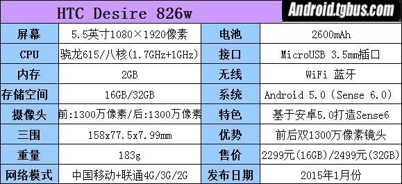 HTC Desire 826采用前後雙置1300萬像素攝像頭,支持高清圖片拍攝。處理器選用高通曉龍615 64位八核處理器,主頻為1.7GHz與1.0GHz。存儲方面,RAM為2GB,ROM有16GB和32GB可選。屏幕采用5.5英寸FHD級顯示屏構成,顯示效果細膩。本次評測的手機型號為826w雙網公開版,兼容中國移動與中國聯通4G、3G以及2G網絡制式。系統采用安卓5.0版本,同時搭載HTC自家Sense 6.0系統界面。