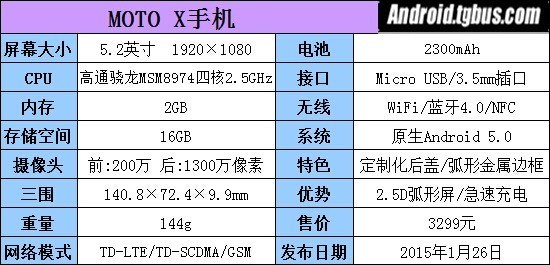 Moto X擁有5.2英寸大屏,分辨率為1920×1080;搭載高通骁龍MSM8974AC四核2.5GHz處理器,采用2GB RAM、16GB ROM;前置200萬像素攝像頭,後置1300萬像素攝像頭,支持零秒快拍。Moto X擁有2300mAh不可拆卸式電池,容量看起來雖小,但它支持極速續能,充電15分鐘可帶來7小時的電量(當然還需要我們後續測試)。目前網上預約的售價是3299元,雖然性價比不如小米、魅族等手機,但勝在產品質量好,功能多樣,手感舒適。