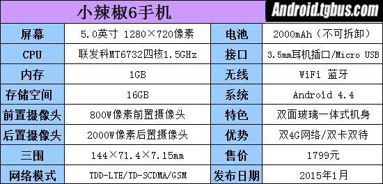小辣椒6手機配備了MT6732四核64位處理器,采用5.0英寸IPS全視網膜屏,屏幕密度高達320PPI,內置1GB運行內存與16GB機身存儲空間;前置800萬像素、後置2000萬像素攝像頭,運行Android 4.4.4操作系統;同時擁有雙卡雙待功能。