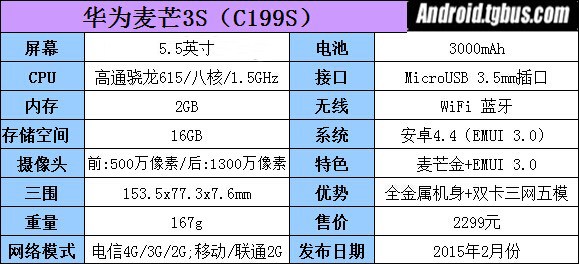 相比之前的麥芒3來說,3S除了支持電信4G全網通外,它還更換了高通骁龍615真八核處理器,主頻達到1.5GHz。屏幕則使用了一塊5.5英寸屏。內存則是2GB與16GB的組合方式,應對日常任務不成問題。前後攝像頭像素分別為500萬與1300萬。續航方面,麥芒3S內置3000mAh锂離子電池,運行基於Android 4.4的EMUI 3.0系統。
