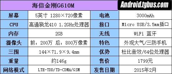 海信金剛手機配備了高通骁龍64位處理器,擁有2G RAM和16G ROM。現在連iPhone6和iPhone6 Plus都只有1G的內存,從價格來看海信金剛G610M的性價比要更高。除此之外還搭載了5英寸720P的屏幕,屏幕材質是更薄、更耐磨、更抗沖擊的康寧大猩猩玻璃。擁有3000mAh大容量電池,保證超強的續航能力,可持續通話高達20小時,在同價位手機中金剛G610M手機的大電池很有優勢。