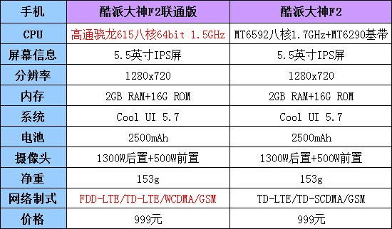 相較於普通版來說,大神F2聯通版與其有所不同,其采用了高通公司的64位八核處理器,型號為骁龍615 MSM8939,主頻1.5GHz。手機的RAM為2GB,而ROM為16GB,最高支持64GB的Micro SD卡進行擴展。