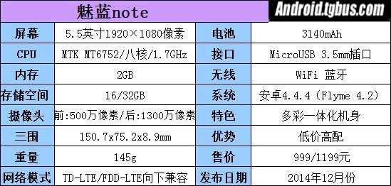 雖然999元的低價很有吸引力,但難免會有人懷疑它的配置。但在你看了它的配置表後就完全不會擔心了。處理器采用MT6752 64位八核芯片,主頻達到1.7GHz,與其對應的GPU則是Mali T760 MP2,主頻則是700MHz,內存全部標配2GB LPDDR3內存。此外,魅藍Note還配備了前500萬後1300萬像素攝像頭,以及一塊3140mAh大容量電池。