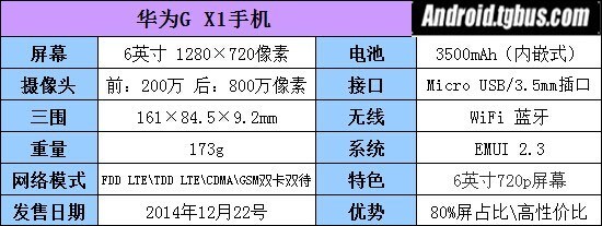 在介紹手機外觀之前要先說說它的配置華為G X1使用了6英寸720p分辨率的屏幕和3500mAh的超大容量電池。