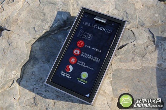 打開盒子後就能看到聯想VIBE Z2這款手機了,手機屏幕上貼著一層印有聯想VIBE Z2特點的保護膜,分別是全金屬一體機身、1300萬像素、64位高通處理器以及安卓系統。
