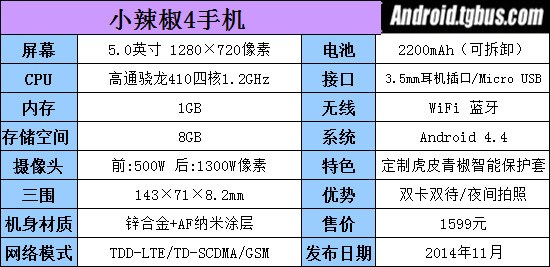 在系統上,小辣椒4也得以完善的升級,配有Android 4.4系統,並且自帶多種LA軟件,其它方面,小辣椒4支持雙卡雙待,主卡支持TDD-LTE(移動4G)、TD-SCDMA/GSM網絡,副卡支持GSM網絡;電池容量2200mAh;售價為1599元。