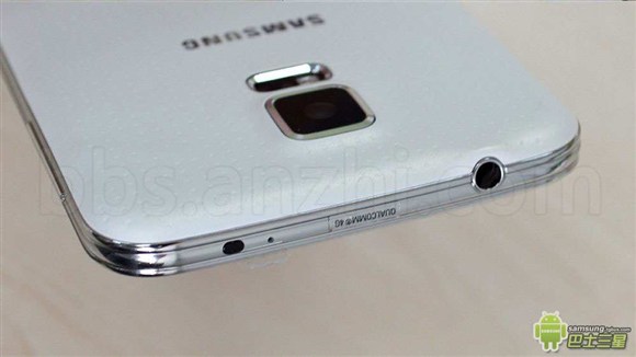 屏幕上方有聽筒,光線、距離感應器和一顆200萬像素攝像頭,該機擁有IP67防水防塵等級,在安全防護方面加入了Samsung Knox企業級安全防護,機身頂部有紅外發射器、降噪麥克風和3.5mm耳機接口,奇怪的是,雖然三星 Galaxy S5 是三防手機,但耳機接口並沒有防水塞。有圖為證。