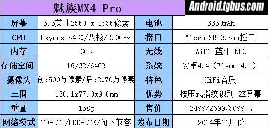 硬件配置方面最明顯的改變就是三星處理器和2K屏幕了。MX4 Pro搭載的是具備20nm制程工藝的三星Exynos5430八核處理器,其中包含四核2.0GHz A15芯片和四核1.5GHz A7芯片。圖形處理上也相應更換為六核ARM Mail -T628 MP6。屏幕為5.5英寸2K屏幕(分辨率:2560×1536像素),采用了全貼合、IPS技術的LCD面板。另外代替MX4圓點Home鍵的則是一個矩形按壓式指紋傳感器,結合mPay功能。系統則升級為魅族最新的Flyme 4.1。